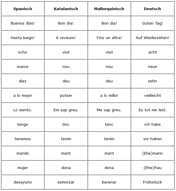Mallorquinisch wiederum ist ein Dialekt des Katalanischen, der auf der Balearischen Insel Mallorca verbreitet ist und von deren Bewohnern Mallorquí genannt wird. Während die allermeisten Inselbewohner auch Spanisch sprechen, hat Mallorquinisch vor allem die Funktion einer Umgangssprache, mit der man sich untereinander unterhält. Die grammatischen Strukturen der drei Sprachen sind recht ähnlich. Sie unterscheiden sich vor allem und am offensichtlichsten im Wortschatz. In der folgenden Tabelle finden Sie einige anschauliche Beispiele für die Unterschiede im Vokabular.